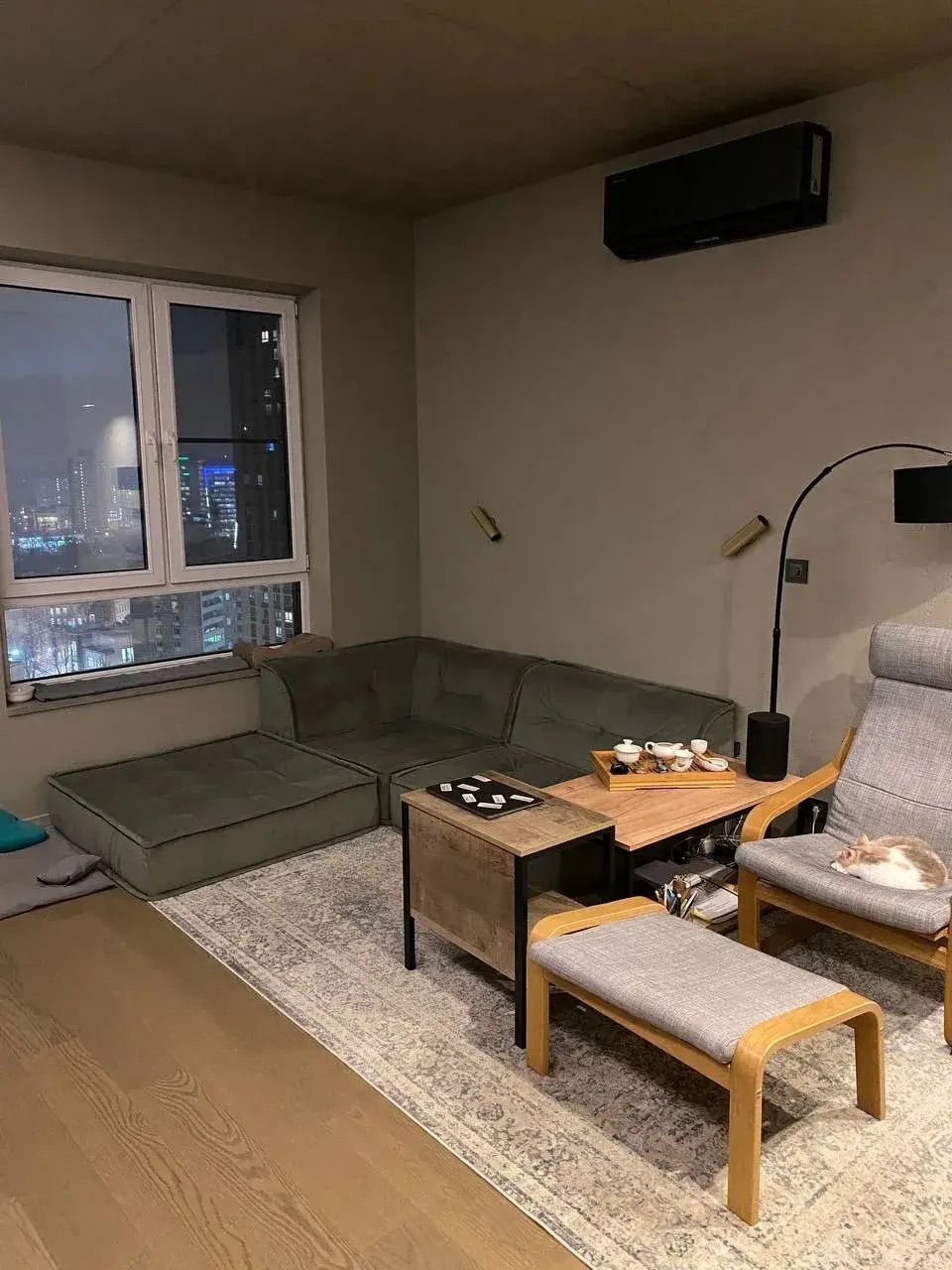 У меня пока временная мебель остальная. Так что не совсем дизайнерские решения сейчас. Но вписался отлично. И не закрыл низкое окно спинкой.